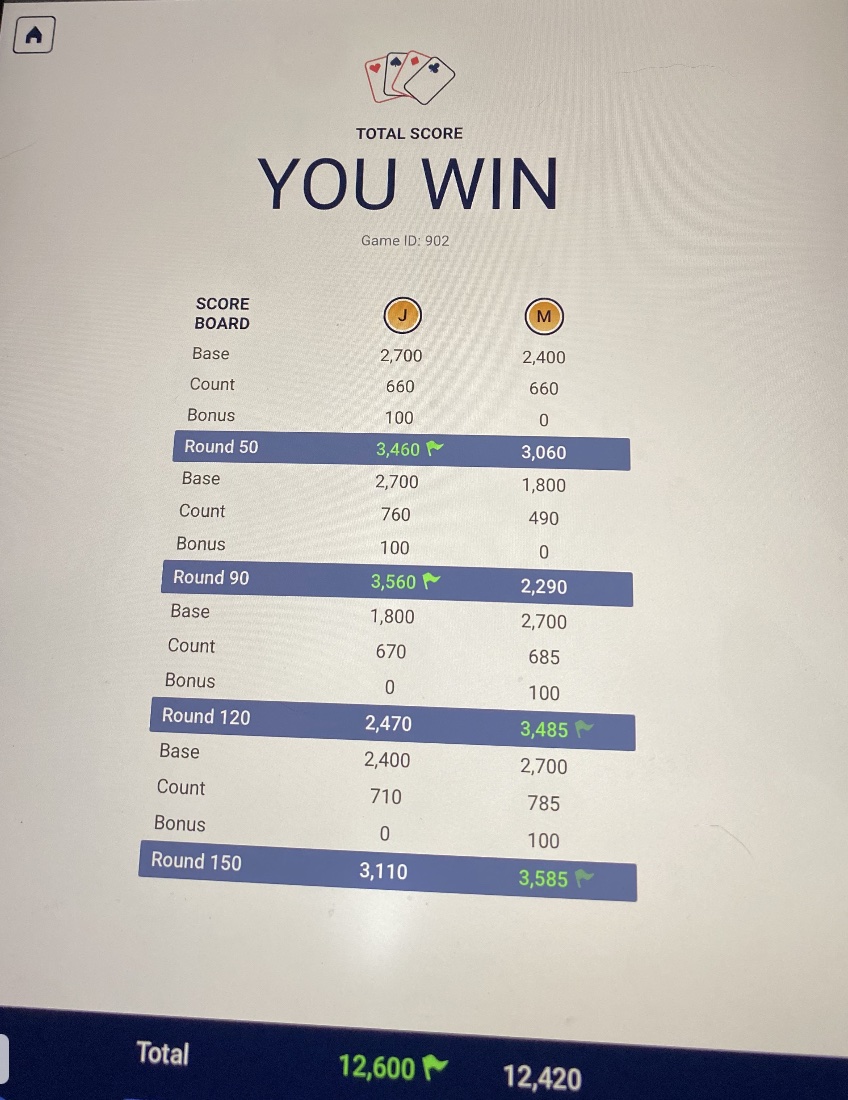 The highlight of the first round was the epic battle between Jaida and Michelle. Michelle was the number one seed going into the tournament as she had the highest winning percentage in two- and four-player games. As you can see from the screenshot above Jaida jumped out to an early lead in the first and second rounds (Rounds of 50 and 90) but then Michelle came roaring back in the third round (Round of 120). In fact, Michelle won the fourth round (Round of 150) as well but fell short in the overall game score by just 180 points. Awesome match and good luck in Round 2 Jaida!