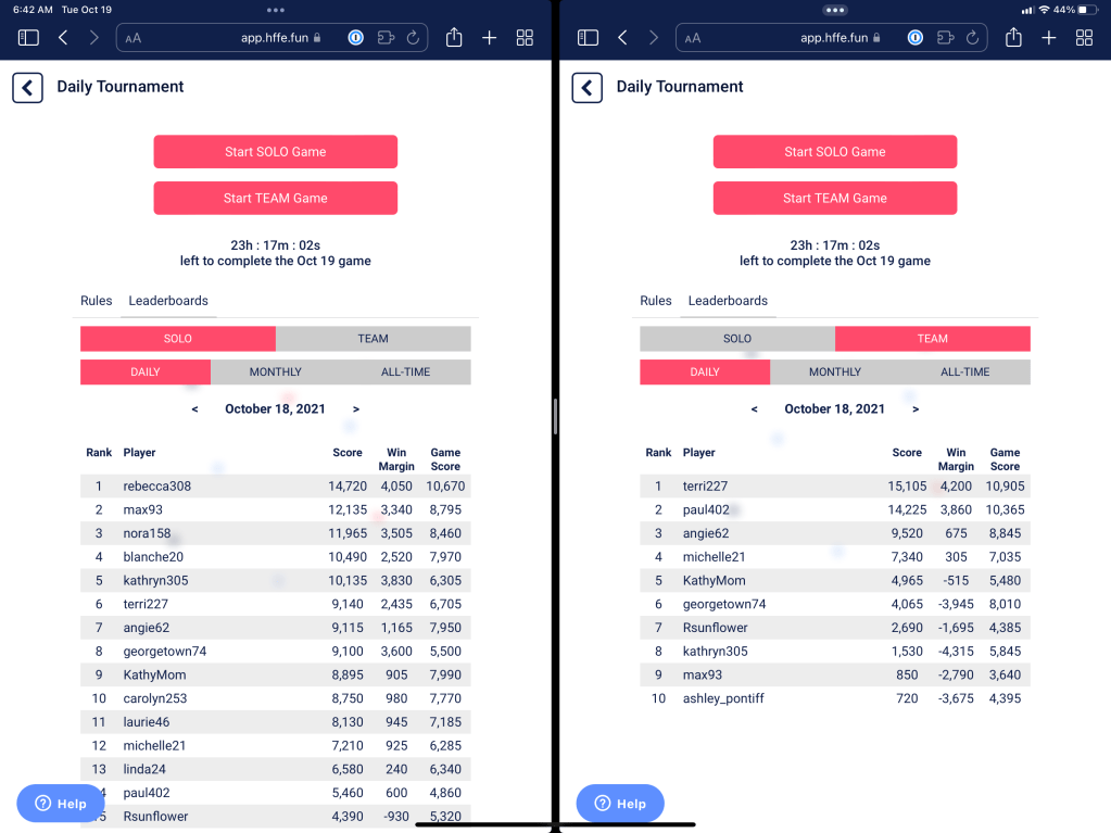 No matter how you did for the Monday tournament the daily scores reset and we get to do it all over again today. If you know of anyone else who wants to play remember they can play for free for 14 days with no credit card required. You can share this link to get them signed up: https://app.hffe.fun?signup=1 Have fun everyone!
