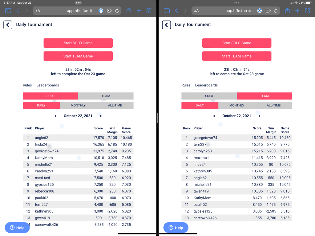 In our SOLO tournament angie62 and linda24 blew the rest of the field away, taking the top 2 spots with scores of 17,570 and 16,365, respectively. After our two leaders, georgetown74, KathyMom, and michelle21 rounded out the top 5.