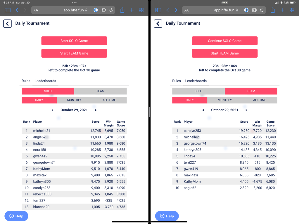 In our SOLO tournament michelle21 took the top spot with a 12,745, followed by angie62, linda24, nora158, and gwen419 to round out the top 5.